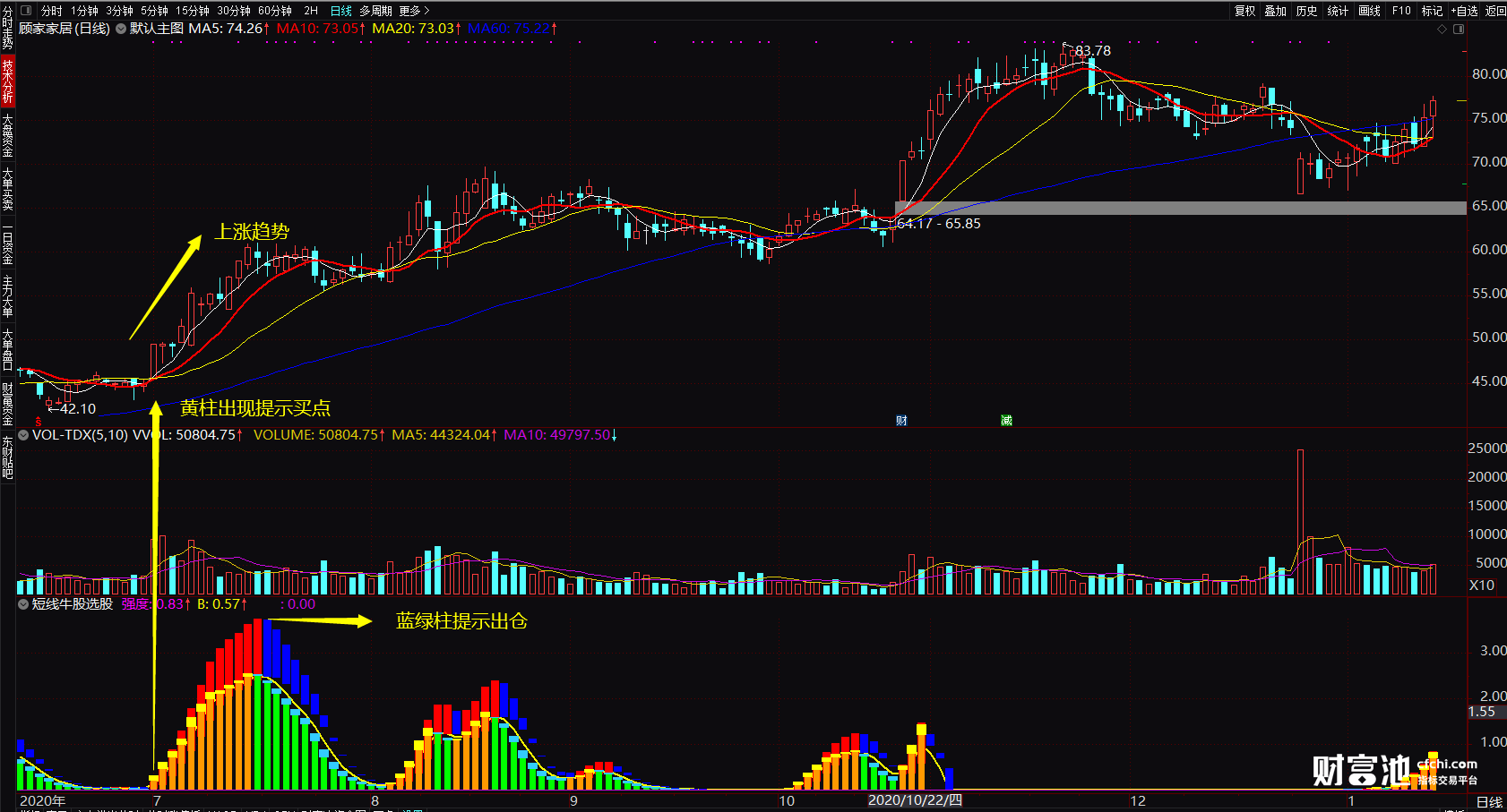 短线选股绝招选股指标适用于短线股票的趋势性投资,由各种颜色的柱子组成,本指标属于实时性指标,盘中若波动剧烈可能出现不同的信号,建议投资者在收盘前的5-10分钟,依据指标信号操作。
