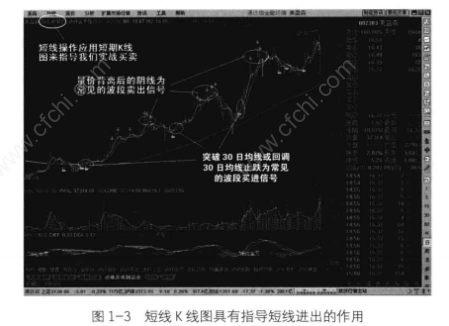 周线或月线K线图具有行情定性的作用,而短期K线图(见图1-3)具有指导我们短线进出的作用。周月线的实体的价格对于我们研判行情的性质有很大的作用,但也不是一破前期实体的低点就马上卖,也不是一过前期实体高点就不管三七二十一马上介入。应该选择最佳的短线买卖点参与,此时短线图表就能发挥很好的作用,如何判断最佳的短线买卖点位后面将会有具体的介绍。