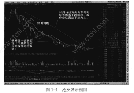 抢反弹(见图1-1 )对应的是处于下跌阶段的股票(20周均线向下,股价呈空头排列),对于这种股票的操作要注意以下几个方面。