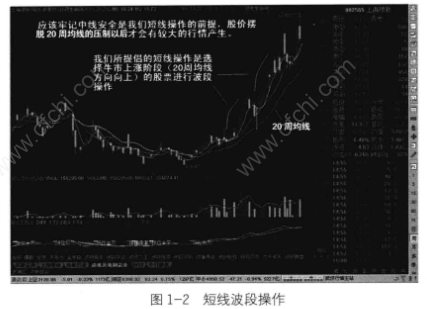短线不一定非要去抢反弹。我们]所提倡的短线操作可以选择处于上涨初中期的股票(20周均线方向向上,股价回踩20周均线止跌)进行波段操作。如图1-2所示。当然,对于筑底阶段的股票( 20周均线趋于走平,股价在20周均线下方形成底部)也可以短线操作。操作这两类股票要注意以下几点。