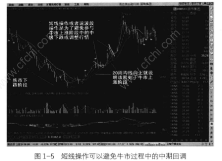 短线操作也是为了尽量避免参与牛市过程中的中期回调(见图1-5),以便能够很好地规避风险,提高资金的利用率。牛市阶段股价也并非-味地 上涨,也会存在中级的调整或下跌,投资者应该尽量避免参与牛市的中级调整或下跌(具体来说就是回踩20周均线的动作)。