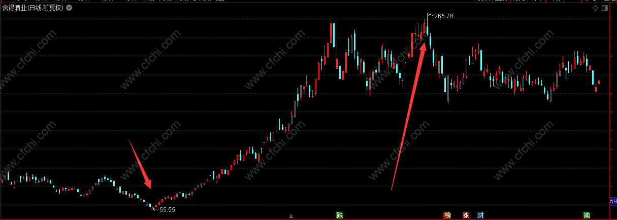 (3)、长线投资碰到好的股票,可以快速翻倍。如下图:舍得酒业600702 翻了五倍。