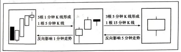 由此回归到上述例子,当时间往前进行,若干的1分钟K线形成了若干的5分钟K线和15分钟K线,市场参与者就会去参考15分钟和5分钟K线的走势,以判断方向,就会影响交易,也就会反过来影响1分钟的走势。