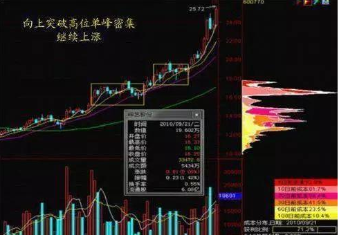突破高位单峰密集。股价经过一段时间的上涨后,在高位形成了单峰密集,随之股价继续突破高位单峰密集,并且创出了历史新高,说明新一轮行情的开启。此时投资者可以结合行情做快进快出操作,股价回落跌破单峰密集的时候则是止损点位。如下图