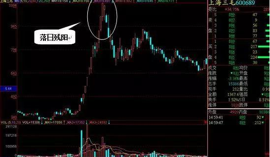 股价在高档收出一根阳线,之后再收一根小阳线,且完全孕育在前一天阳线的实体内,这通常是股价上升乏力的迹象,表面股价即将回档整理。本组合图形看起来就像夕阳西下,虽然十分美丽,却常常是黑夜即将来临的先兆,如果接下来继续低开,可以考虑及早离场。