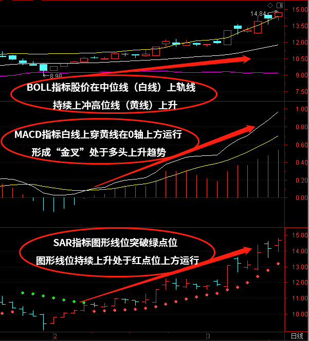 满足以上条件的情况下,MACD技术图形中的“金叉”和BOLL(布林线)指标股票价格处于中位线和高位线区间同时上行,股价出现有效突破高位线形成上升趋势。加上SAR技术图形股票价格线位有效突破绿点位,处于红点上方运行。可作为技术组合图形的参考买点机会信号。(如下图所示)
