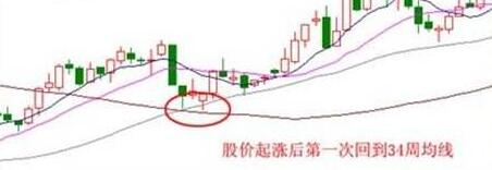 此外,经过长时间调整的股票,其周k线上出现7周均线与14周均线双双跨越34周均线之时,便是黑马标识最为强烈的时候,也是建仓的最佳良机。如图2,宁波华翔在2009年3月的走势便是如此。其次,股价启动后回调、再次与34周均价相触往往是调整到位的重要标识,这表明,第一波的回档已近底部,显示出又一次建仓机遇,而且第二波的上升将远远超过第一波。同时7周均线又一次与14周均线形成黄金交叉,这一标志是黑马第二次腾飞的重要信号。如图3,宁波华翔在2009年8月回调至34周均线并在次启动。