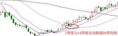 一是均线运行要素。当7周均线上穿14周均线时,坚决买进;反之,当7周均线下穿14周均线时,就应毫不留恋地卖出。