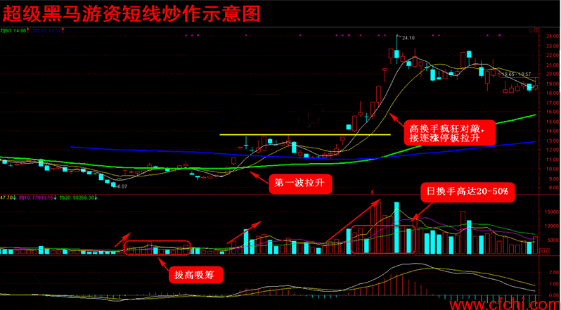 短线游资黑马经常是指在中小盘个股中,突然暴发某种市场利好,游资趁机疯狂强势吸筹,然后进行快速对敲拉升并迅速出货的一种黑马炒作行为。