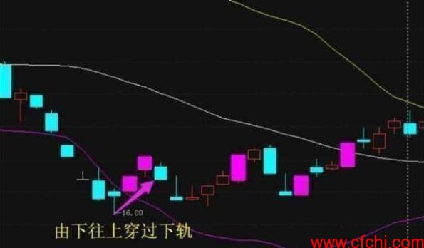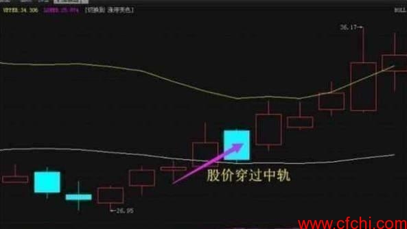 2、价格由下向上穿越中间线时,股价可能加速向上,是加码买进信号。