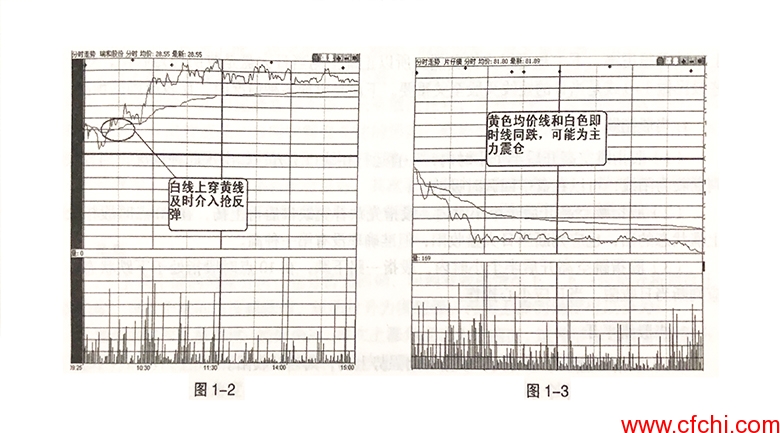 第二种:抢反弹的典型形态。不过,这种分时图走势不一定非要在抢反弹的时候才出现。上升通道中的个股也会有这种走势。横盘不介人,在白线突然向上穿过黄线,伴有大单成交时,迅速跟进。如图1-2。