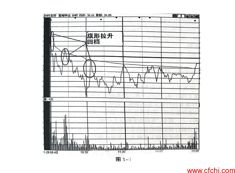 第一种:“拉旗杆”形态。这种形态往往是主力在开盘后迅速在15分钟内抬高股价然后全天横盘,让当日的换手成本比前一日高出一截。这种形态往往在股价上升时伴有大的成交量,是主力自买自卖对敲所致。出现这种形态时,可以迅速跟进,胜算较大。如果成交量显著放大,这种形态的股票有可能出现涨停。如图1-1