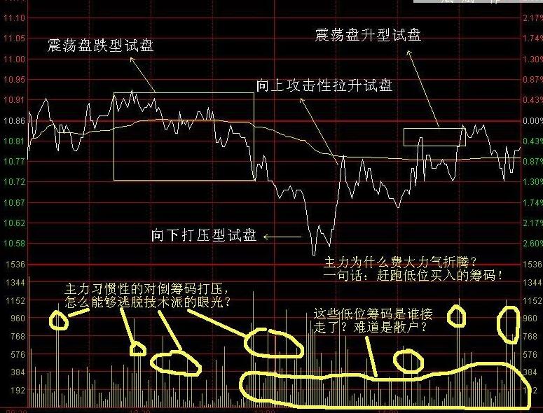 当主力计划要进驻一只股票时,第一个动作就是要试试盘中筹码的稳定程度,看看有没有别的主力在里边,如果有,就得考虑建仓时的抢筹拉升时的配合等等问题,但是实力强大的主力不喜欢进驻有别的主力的股票,如果非要硬抢,则要将原来的主力震出去。试盘波同样适用于K线级别上的走势图。例图2: