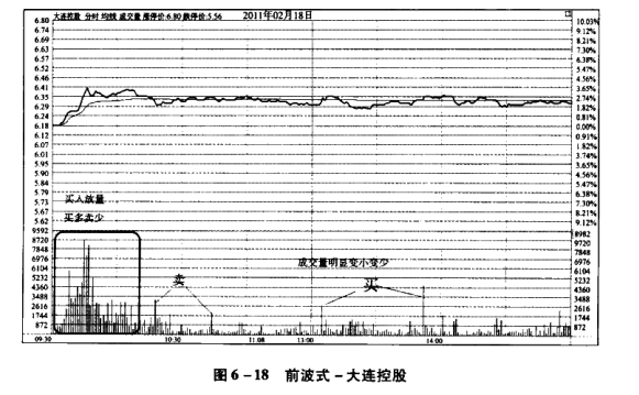 大连控股―看图6-18,主力在开盘就开始拉升,属于常见的拉升图中的一波式之前波式。在主力拉升后,没有进行第二次大的拉升。从后期走势看,股价近乎呈:“一”字形横盘,说明卖出量对股价的影响甚微,也说明筹码的稳定性相当好,主力的工作比较到位。前期的吸筹建仓工作是应该得到肯定的,后期的工作完全有足够的理由可以开始。