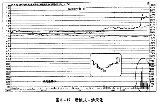 泸天化从图6- 17看,前期走势比较平滑,股价的波动不是很大,好像没有主力过多活动的踪迹,这种走势多见于大盘走势不好,早盘、午盘有一定跌幅,主力处于观望阶段。在尾盘主力开始展开工作拉升股价。属于典型的分时拉升图一波式之后波式。