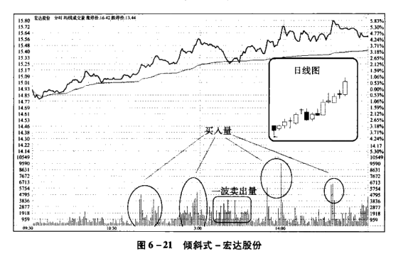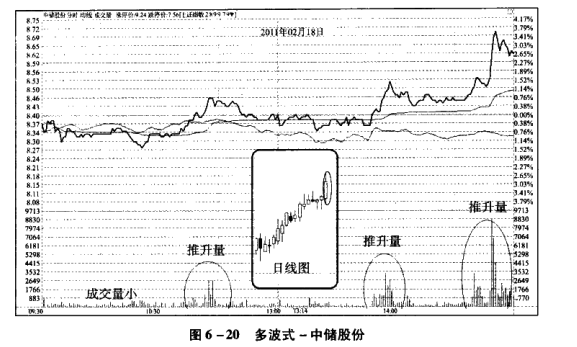 中储股份图6-20分时线的走势可分为三波,每一波上升后股价会有一个调整期,图中的曲折多一些,但是我们仔细观察会发现,每一波上升之后,股价进入回调,回调会在一定的位置形成极好的支撑,这也为主力的下一次拉升提供了较好的条件。每一波上升都具有一波推升成交量,推升量并非全部是买入量,它的一个特点是,前期是买入量后期是卖出量,买入量大于卖出量。