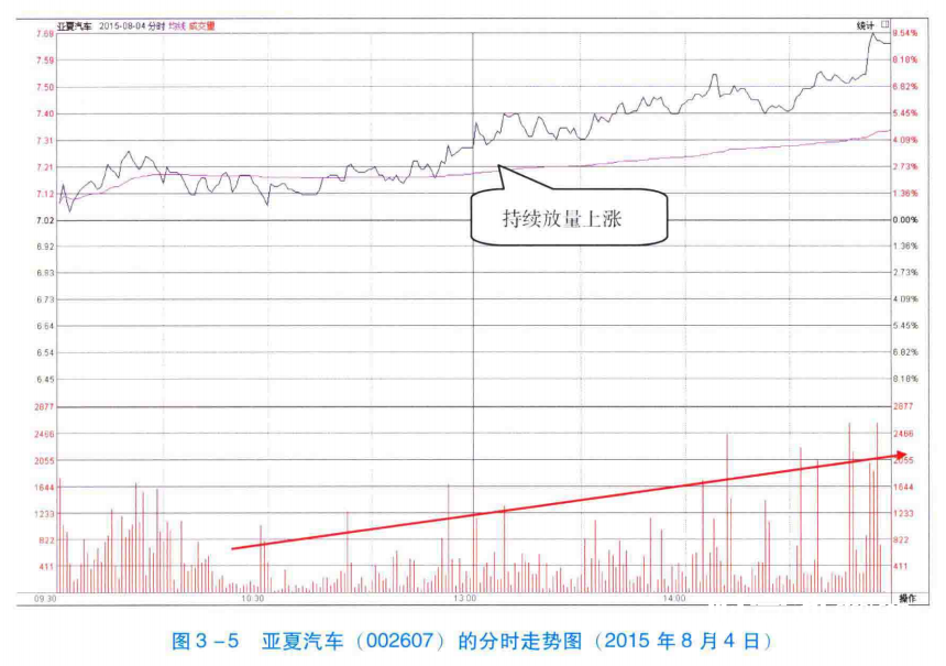 如图3-5所示,2015年8月4日,亚夏汽车(002607)持续放量上涨。这样的形态说明随着股价的上涨,越来越多的投资者买入股票,该股进入了良性的上涨周期。这是未来股价将持续上涨的信号。看到这样的形态后,投资者可以积极买入股票。