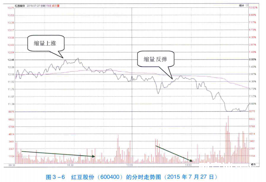 如图3-6所示,2015年7月27日,红豆股份(600400)开盘后缓慢上涨,但其成交量却持续萎缩。这样的量价配合形态说明投资者对该股后市普遍持谨慎态度,追高买入的投资者越来越少,股价有见顶下跌的趋势。在这次上涨过程中,投资者应该逢高抛出手中的股票。