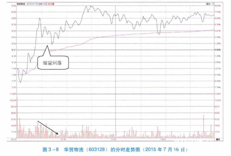 如图3-8所示,2015年7月16日上午,华贸物流(603128)在持续上涨的过程中形成了回调整理行情。在这次回调整理过程中,该股的成交量持续萎缩。