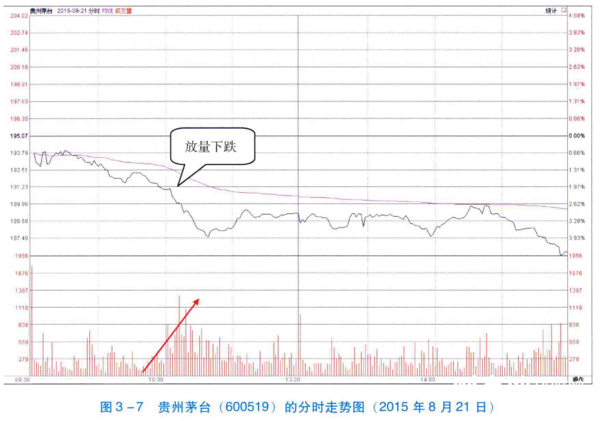 如图3-7所示,2015年8月21日上午,贵州茅台(600519)开始下跌的同时,其成交量也持续放大。这说明随着股价的下跌,越来越多的投资者因为恐慌而卖出股票,该股进入了恶性的下跌周期。