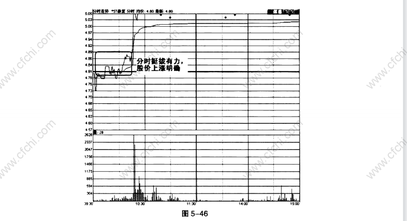 股价第二波的上涨力度更大,同时分时线挺拔有力,在成交量放大的推动下,股价便开始连续上涨。分时线此时的走势具有了明显的强势特征,因此投资者可以在这个时候放心大胆地进行短线操作,强势特征一旦出现,股价也必然会延续(图5-46) !