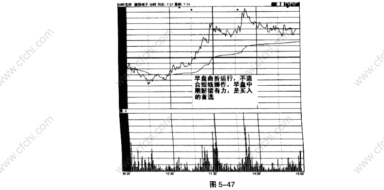 股价盘中强势上涨时的分时线与开盘时的分时线运行状况进行对比,可以看出明显的差别.开盘时的分时线曲曲折折、而上涨时的走势却是圆滑流畅并且挺拔有力,具有明显的强势特征。这种分时线的运行状况是短线操作的首选(图5-47),具有这样分时线运行方式的个股也必然是强势个股。