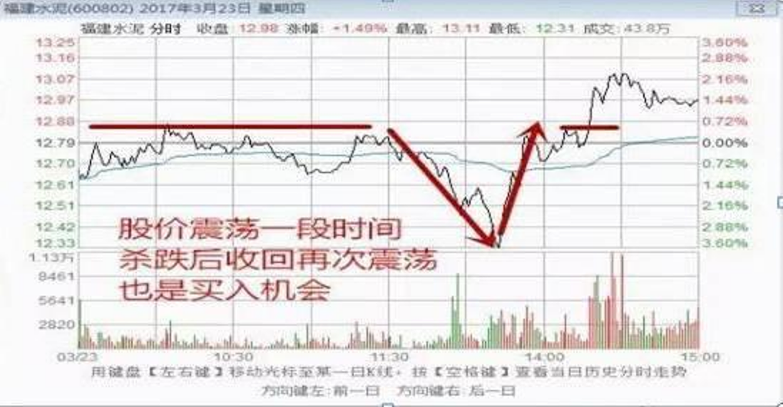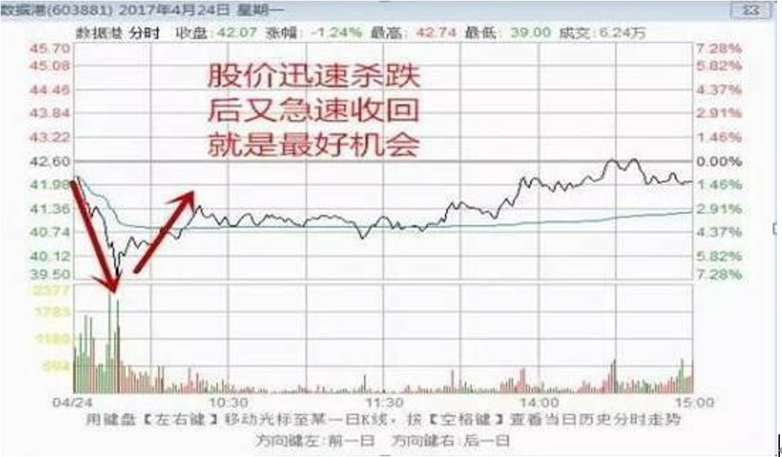 这种现象也就是V字反弹,股价急速杀跌后又急速收回,在站上均价线上就是最好的买入机会,这是一种探底推升的形态。