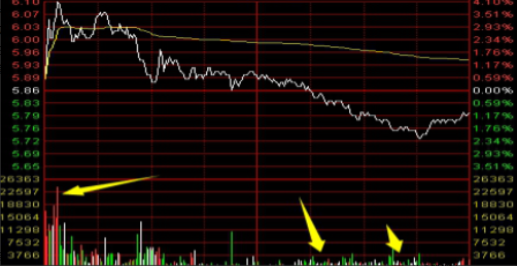 从分时图看出货(股票)首先你要确定当前分时图的成交量是大是小,分时图成交量柱子的高低是由第一根柱子的大小为比例显示的,比如早盘竞价的成交量是1000万,如后面的成交是一百万一笔单,在这种情况下分时图的成交量上会显示的很小(实则100万的单子都记录为主力行为),因为这笔一百万的成交量只有一千万的十分之一,所以在分时图上看上去会很小,主力通常用这种手法来欺骗散户达到出货目的,如下图;