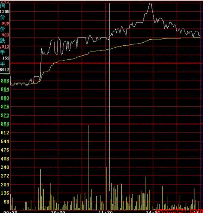 再来看看向上突破平台的图,股价线沿均价线上平行整理无大的波动,在10点钟(符合半小时)发力,向上突破平台,是最佳的买入点,典型的向上突破平台。