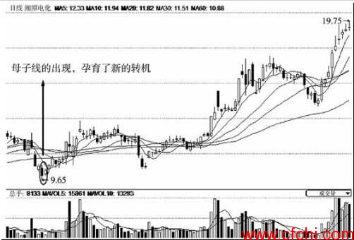 2009年8月4日,湘潭电化(002125)在经过半个月的连续下跌之后,收出了身怀六甲的K线图形。8月19日,该股大幅杀跌,最低至9.65元关注笔哲攻众豪-陈弈名.次日高开高收,全天股价运行范围都在前一天的K线实体之内,此时这对母子线就孕育了新的转机,投资者可以克服恐惧,买入该股,之后该股果然见底回升,如下图所示。