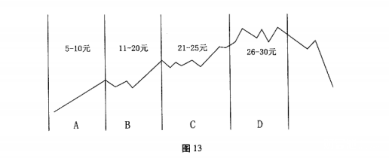 假如一只股票从5 元涨到30元(如图13),正确的操作应该是:在5~10元处(图中A区域)建仓,在11~20元处(图中B区域)持股,在21-25元处(图中C区域)派发,在26~30元处(图中D区城)观望。