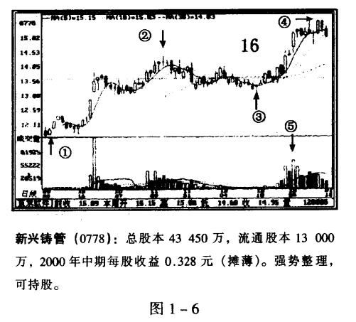 在图1-6上下跌浪的22个交易日中,明显的阴K线是10根,则累积净卖出量是1 000万股。