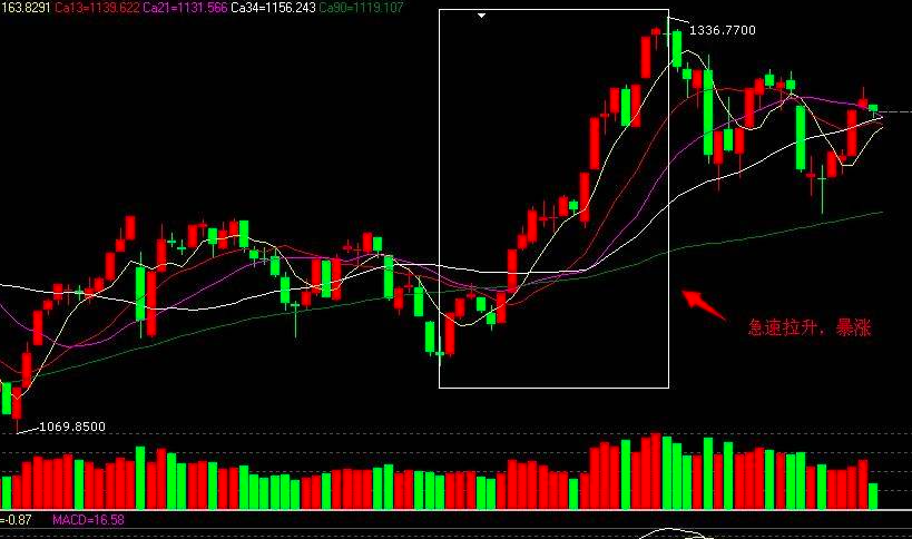 (1)庄股在启动初期,经常会出现连续逼空的行情。随着行情的展开,成交量也会连续放大,这是股价拉升突破初期阻力的一个盘面现象。对主力来说,时间比资金更重要,因此他们采用了用空间换时间的手法快速拉升股价。同时,快速拉升股价容易产生暴利效应,能更好地起到诱感投资者的作用。