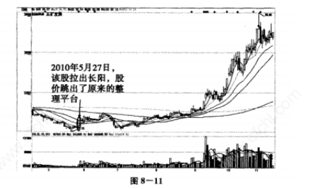 由此可以看出,主力此前拉出的那根大阳线实属试盘行为。该股从6月23日后又开始了一段整理行情,在9月8日又拉出了一根长阳线之后,才开始了一波真正的上涨行情。如图8- 11所示: