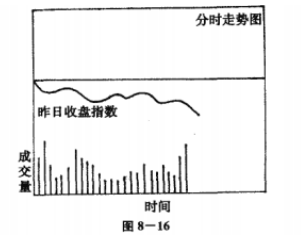 5.如图8-16,主力根据盘中价量关系变化了解到散户急于出脱持股,追高意愿弱,盘面表现为价涨量缩、价跌量增的背离走势,且价位始终在前一交易日收市价以下波动,盘势极弱无疑。