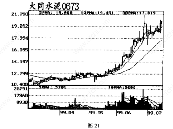 此后,该股稍做盘整,便开始进入主拉升阶段,最高涨至21.79元。回首该股的走势,很容易发现庄家在借机洗盘。这种情况很少出现,但其变形形态应较为常见。如航天科技1999 年5月18日缩量跌破30日均线,第二日以大阳线收复失地,并展开上攻行情。