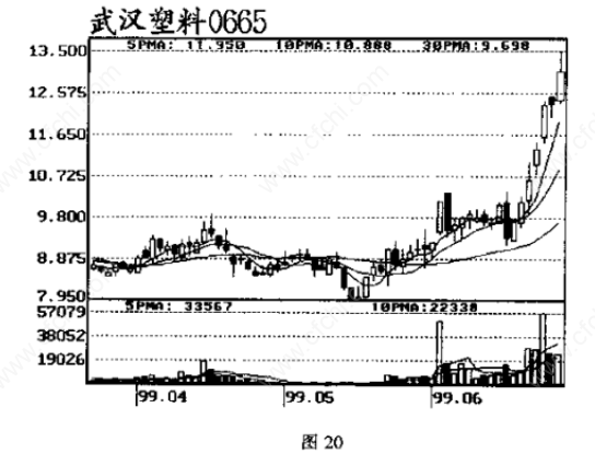该股1999年3月初自底部启动后,在30日均线上方做平台整理,5月10日,受“导弹缺口”的影响,该股跳空低开,冲高后上因档抛压太重,比家顺势打压,尾市该股跌停报收,第二日,利空释放后大盘反弹,该股则路涨停,并没有需要多少成交量的配合。