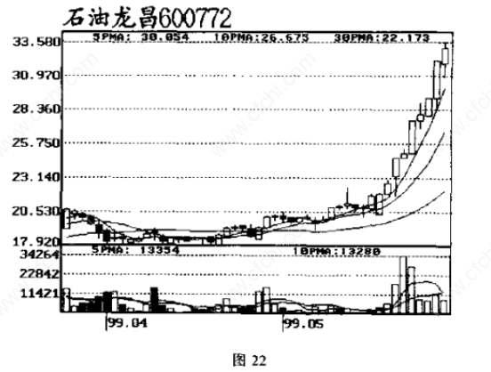 1999年“5.19”行情启动前,石油龙昌走势一直强于大盘,并月于4月21日正式启动,进入主拉升阶段,5月12H,该股缩量突破前期高点后有问调迹象,5月17B、18H两天,石油龙昌的成交量突然臧少,分别成交7.93万股8.53万股,而此前一周该股平均每H成交量都在20万股以上。19日,石油龙昌启动,后直奔33.58元。
