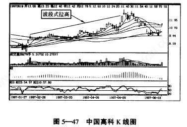 如果庄家实力强些,或所持股票盘小,庄家拉抬可能采取波段式操作,每拉一定幅度,洗下盘。洗盘幅度比台阶式庄家要大,因此留下来或新加入的都是意志坚定多头,此类庄家多志存高远,该股升幅较大。像前面提到的中山火炬和中国高科就是采取这种波段操作方式。