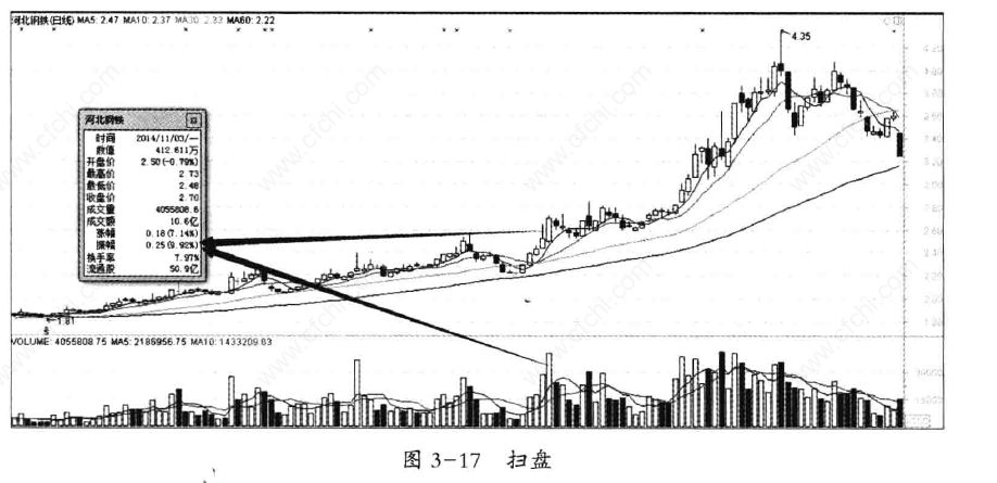 所谓扫盘,是指在涨势中常有大单从天而降,将卖盘挂单悉数吞噬(图3-17 )。在股价刚刚形成多头排列且涨势初起之际,若发现有大单一下横扫了买卖队列中的多笔卖盘,则预示庄家正大举进场建仓,是投资人跟进的绝好时机。