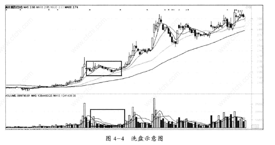这种洗盘动作可以出现在任何一个区域内,其基本目的就是清理市场的浮动筹码,抬高市场整体持仓成本。见图4-4。