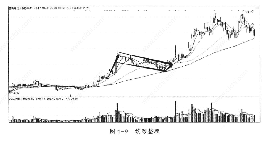这种图形的形成过程是:庄家将股价连续拉升至目标价位以后,开始反手打压,扼制股价上涨,在图形上制造下降通道,使得散户认为该股上档压力沉重,有一波一波逐步走弱迹象,于是在恐惧之中匆匆获利了结,以保全胜利果实。这样在第二波反弹以后,就会有更多的人无法忍受压力而抛出股票。当庄家明显感觉到抛压减轻时,便会掀起新一轮攻击波。在K线图上,该股的走势更像一面旗帜迎风招展。