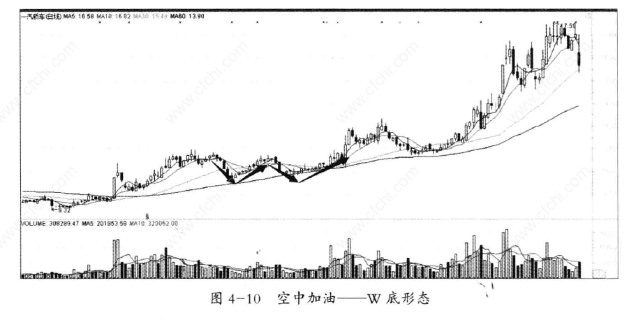 空中加油形态,是指股价有一定涨幅后,在中位庄家利用手中的筹码控盘作图,一方面清洗获利筹码,使筹码充分换手;另一方面重新吸引多头买气和跟风盘。此时庄家往往在震荡中划出漂亮的双底形态、头肩底形态和三重底形态。见图4-10。