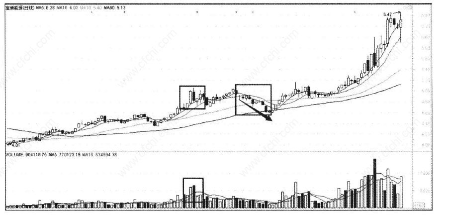 (1)第一种是先拉高,然后向下连拉阴线,阴线的收盘价跌破启动阳线的开盘价,造成向上假突破的迹象,则第一天放量参与的人都会斩仓出局,而前阶段参与该股的投资者,也“吓”出来了。