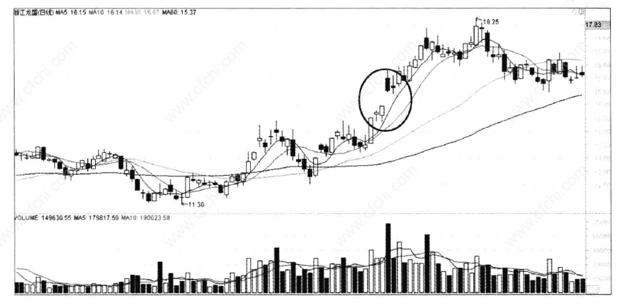 (5)具有良好的技术形态。如均线系统呈典型的多头排列,主要技术指标处于强势区,日K线连续飘红收阳。