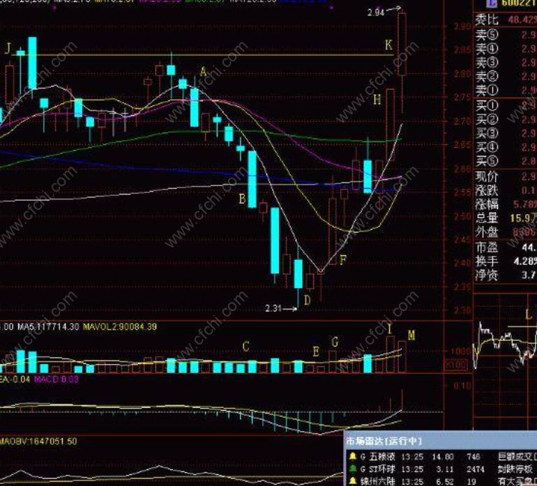 (4)MACD指标在高位形成死亡交叉或M头,红色柱状不能继续放大,并逐渐缩短时,要马上弃庄离场。