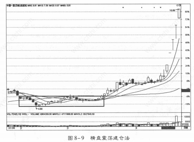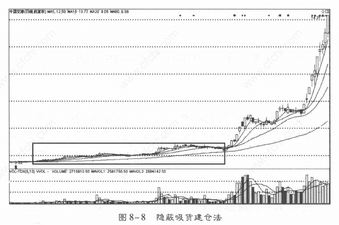 此种建仓法多出现在年底和年初,此时市场沉寂,而庄家悄然进场。特点是震荡逐步缩小,底部逐步抬高,筹码向低位转移。说明庄家悄然进场,只在自己计划区域横盘吸货,但大资金进场,必然构成底部抬高,筹码密集(图8-8)。