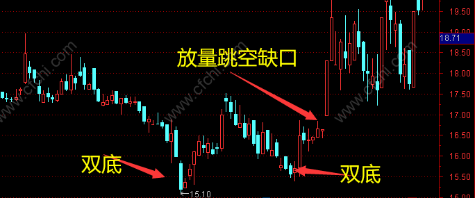 如下图所示,形成双底技术形态后,向上跳空高开,量能放大。突破双底颈线位后,走势不再犹豫,轻松上涨。