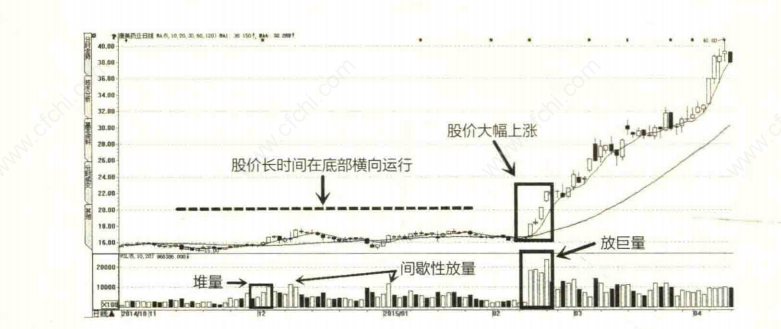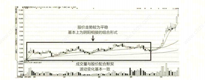 所谓的横盘型长期震荡整理,指的是庄家在某一个价位动用大手笔,将抛单全部吃下。此时庄家如蓄势勐兽,只要股价稍微冒头,庄家就会勐力打压。如果出现了抛售,那么庄家就照单全收。一般来说,庄家如果使用这种方法来完成吸筹建仓,那么就会在图像上留下K线阴阳相间和成交量比较均匀的两个特点。