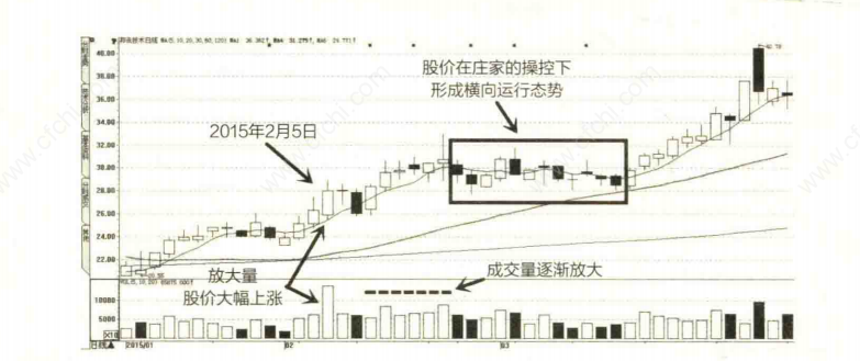 由于庄家的积极介入,本来表现沉闷的股价在成交量明显放大的推动下会变得非常活跃,呈现出价升量增的量价关系。随后,庄家为了给以后的大幅拉升打下良好的基础,就不得不将短线投机跟风盘洗掉,这样就在K线图上形成了股价上升后横盘震荡的图像。